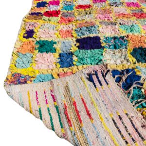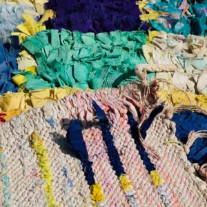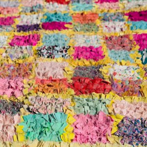 Moroccan weavers use recycled materials, strips, and rags to create their Boucherouite rugs. They mix these with a wide variety of worn-out clothing and textile materials (wool, cotton, synthetic fibers, lurex, nylon, etc.) to define the dominant colors of their Boucherouite carpets. The design process is then very spontaneous and representative of the memory and past of the Berber woman. Boucherouite rugs can be an explosion of bright and warm colors, as well as a softer expression of the weaver’s sensitivity, with more muted tones. These rugs do not imitate or reproduce elements of the surrounding nature, but rather emotions and feelings. It is a more abstract artistic expression that nonetheless results in an often orderly, vibrant, and colorful ensemble. The Boucherouite rug is a marvel of Berber art, remarkable for its authenticity as well as its aesthetics.